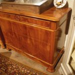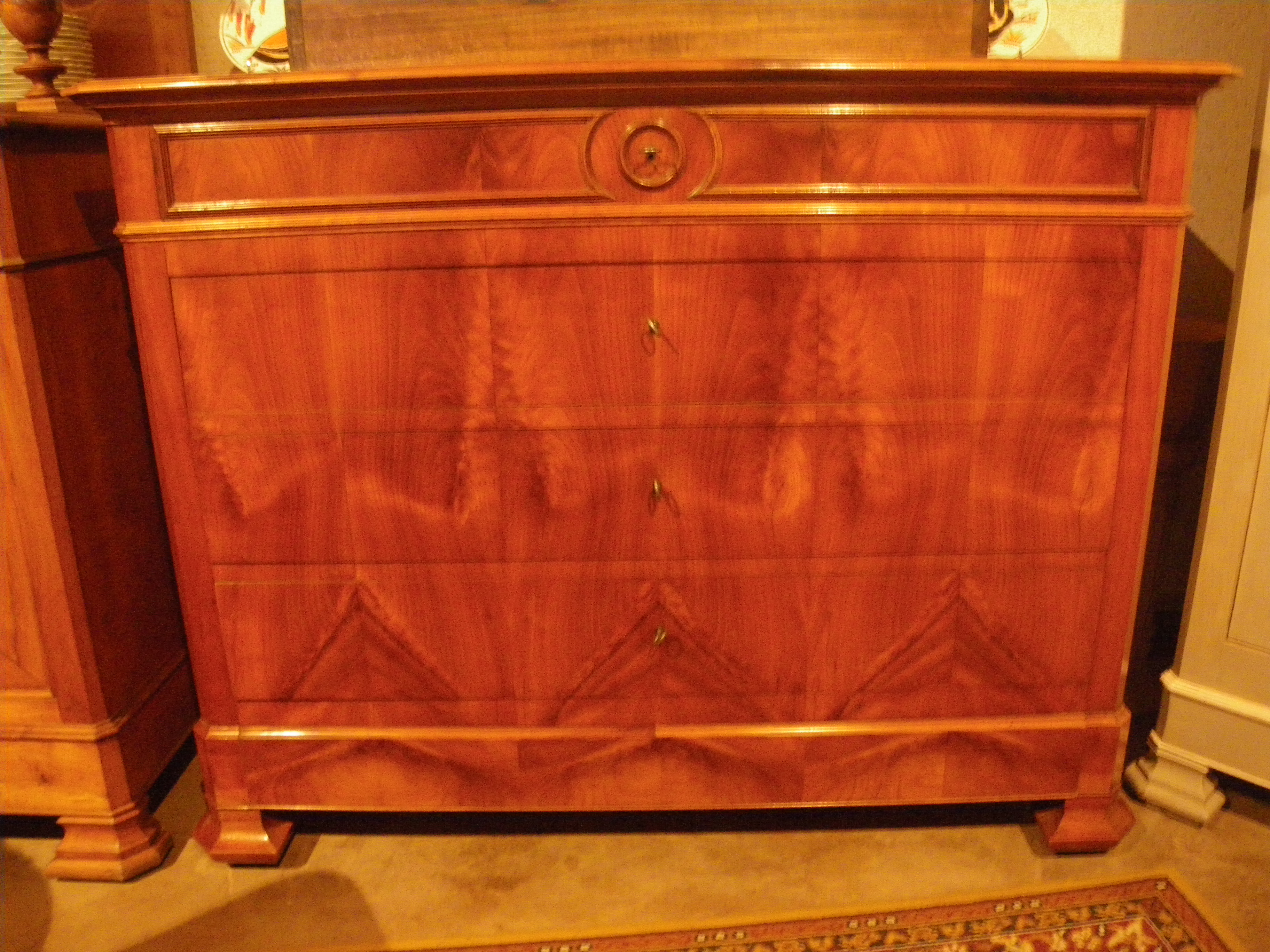 Commode 1900 en cerisier, 5 tiroirs dont 1 tiroir dans la plinthe, très bau placage en façade, dessus bois, côté appelé côté glace.